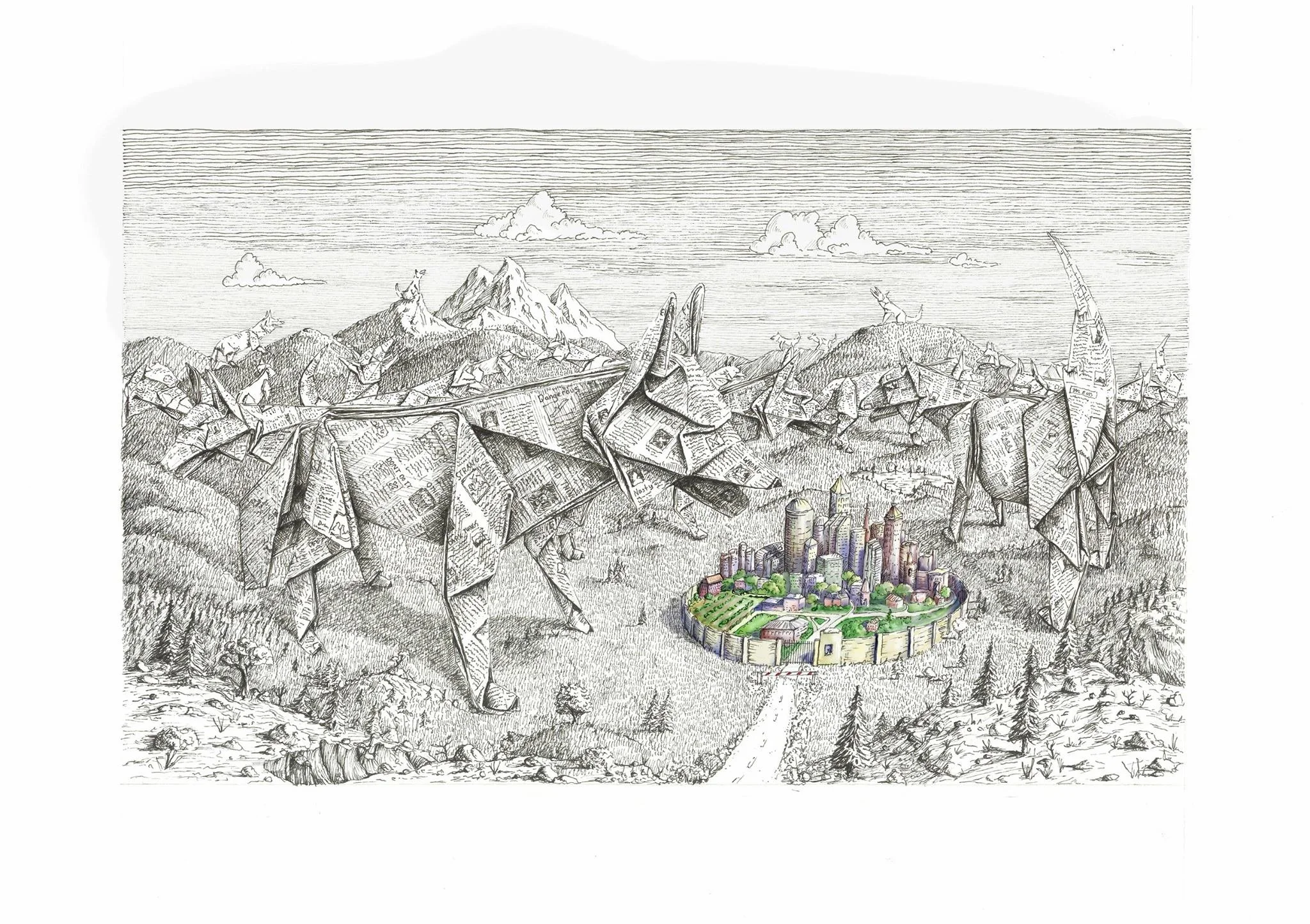 During the COVID-19 lockdowns of 2020, illustrator Tom Morgan and Amie were in a seventh-floor flat together in Valladolid, Spain, unable to go outside for anything except groceries and medicine. They decided to make something together, and passed creative work back and forth — one day he would draw in response to her writing, the next she would write in response to his drawings. It was their way of making sense of a strange and isolating time. Tom drew first. What follows is what they made.